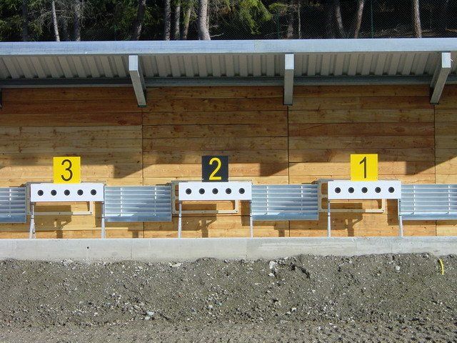 Standnummern in den Farben schwarz auf gelb und gelb auf schwarz. IBU-regelkonform in Grösse und Schrift und direkt auf den Schiessständen montiert.